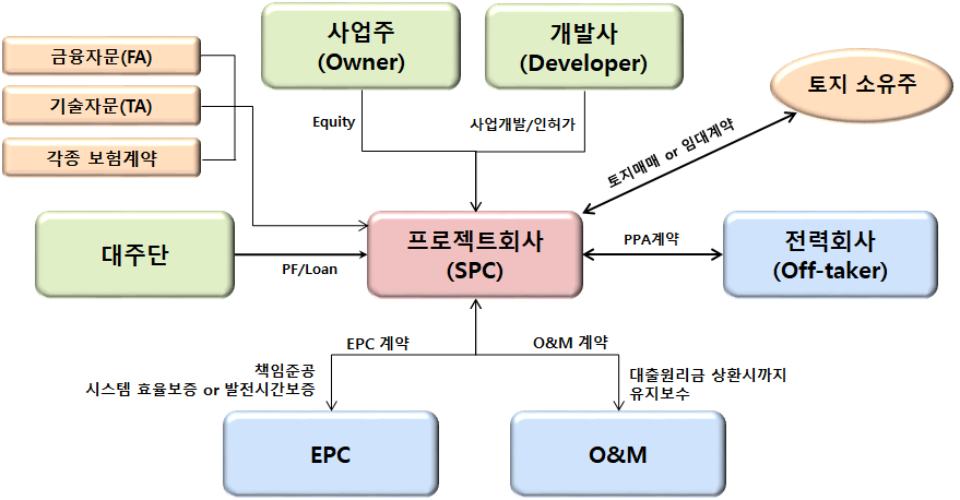 - 대주단(금융기관)은 EPC/O&M사의 책임준공, 보증, 유지보수 등을 담보로 SPC와 대출약정계약 체결 후 PF 인출