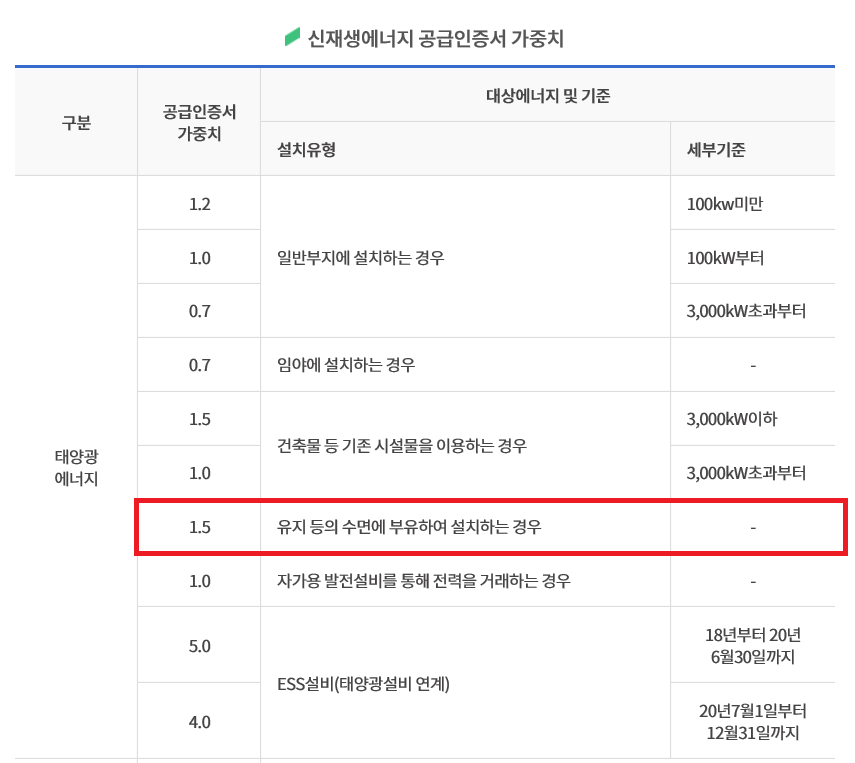 우선 수상태양광의 REC 가중치는 1.5 입니다. 즉, 1.5배 만큼의 매출을 기대할 수 있겠죠.