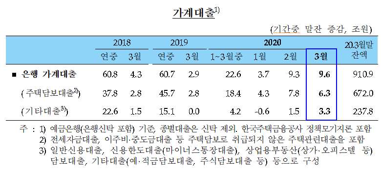 □ 3월중 은행 가계대출(정책모기지론 포함)은 전월에 이어 큰 폭 증가(20.2월 +9.3조원→ 3월 +9.6조원; 19.3월 +2.9조원)