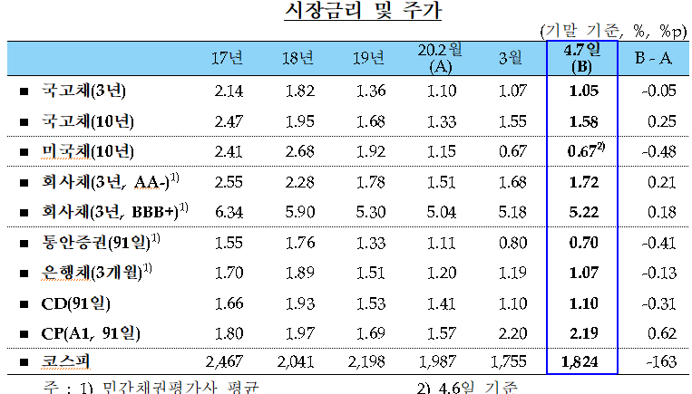 ▣ 국고채(10년)금리는 국제금융시장에서의 미 달러화 확보 움직임, 향후 국채 공급 증가 전망 등으로 상승(20.2월말 1.33(%) → 3월말 1.55 → 4.7일 1.58)