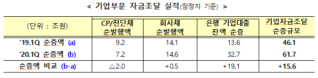 □ ’20.1분기 기업의 자금조달 증가폭은 ‘19.1분기 대비 크게 확대(+46.1 → +61.7조원)