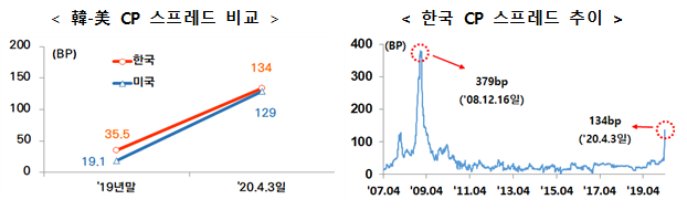 ㅇ 또한 CP 스프레드가 미국 등 다른 국가와 비교해서 많이 벌어진 것은 아니며, 과거 글로벌 금융위기 시에는 379bp까지 상승하기도 하였음