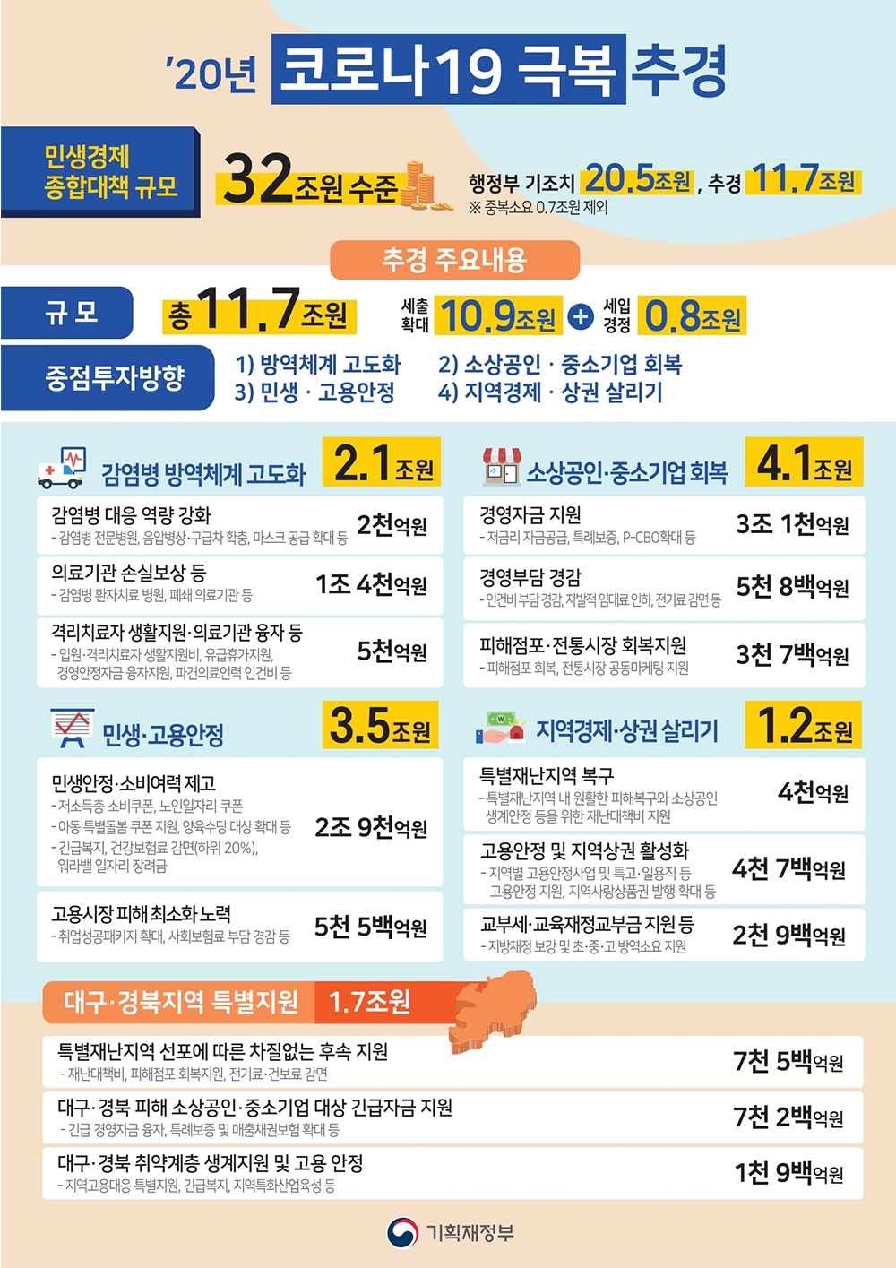 또한 이번에 코로나19로 특히 심각한 타격을 입고 있는 대구 경북 지역에 특별지원으로 1.7조원이 집행됩니다.