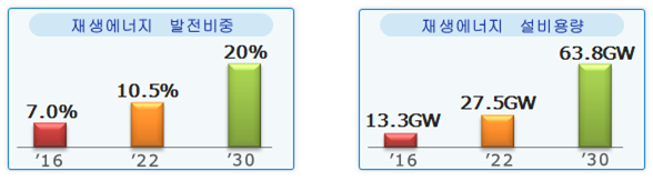 ㅇ (목표) ’30년까지 재생에너지 발전량 비중 20%를 목표로 설정
